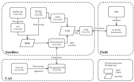In this context, the objectives of this study were to (1) produce a fine-resolution LST by downscaling MODIS TIR data using the DMS algorithm; (2) compare the downscaled result with UAS TIR imagery; (3) estimate TVDI values based on the NDVI and downscaled LST; (4) evaluate the performance of the downscaled TVDI to monitor SM using in-situ measurements.