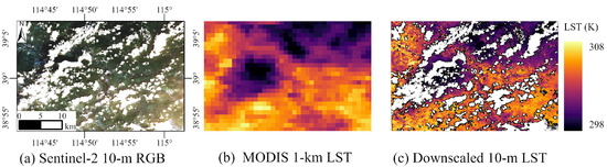 Input data ((a) 10-m Sentinel-2 RGB, (b) 1-km MODIS TIR) and output data ((c) 10-m downscaling TIR) in downscaling area.