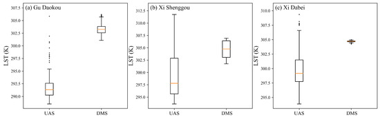 To evaluate the performance of the DMS method in the study area, the downscaled LST data of each scene was compared with the thermal data from the UAS flights at three different sites (Gu Daokou, Xi Shenggou, Xi Dabei). The results were evaluated visually and quantitatively against the aggregated LST data from the UAS.
