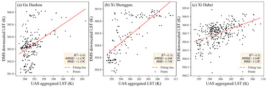 Figure 7 shows the scatter plots comparing the aggregated LST data measured by the UAS with the downscaled LST data collected by the satellite at three flight sites. (Coefficient of Determination), RMSE (Root Mean Squared Error), and MAE (Mean Absolute Error) were computed to observe the consistency and uncertainty between downscaled LST and UAS LST. Due to the uniform and dense vegetation covering Site 1, the temperature distribution was highly concentrated, which introduced difficulties in establishing a proper correlation. The other two sites (Xi Shenggou and Xi Dabei), however, showed a relatively reliable linear relationship between the downscaled LST data and the actual UAS LST data based on the (0.74, 0.51 in two sites). The RMSE and MAE are 6.44 K, 5.94 K, and 5.72 K, 5.32 K for two sites.