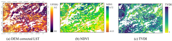 Input data ((a) 10-m DEM Corrected LST, (b) 10-m NDVI) and output data ((c) 10-m TVDI) of TVDI method in downscaling area.