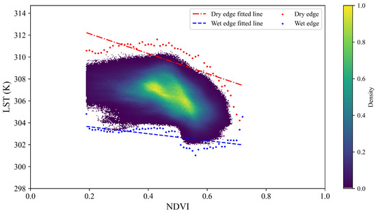 Dry/wet edges and their fitting equations derived from density scatterplots of NDVI and downscaled LST.