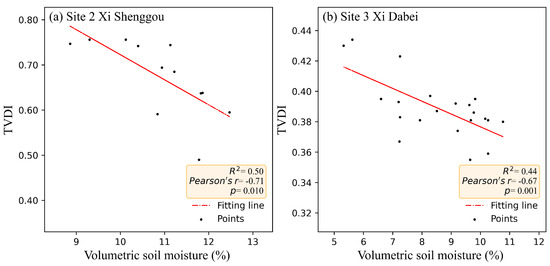 Typically, the correlation analysis was used to assess the ability of TVDI to capture the spatial-temporal soil moisture variations [29,30]. In this study, Pearson’s correlational analysis was adopted to assess the downscaled TVDI performance. Figure 11 displays the scatter plots for the obtained TVDI data and the in-situ measured SM in the two sites, where a significant negative correlation was observed. The Pearson correlation coefficient (r) values ranged from 0.67 to 0.71, with p-value smaller than 0.05. By validating at two sites on individual days, it was suggested that the TVDI obtained through the downscaled LST data could capture the spatial variation of the SM at fine resolution. The slightly higher r at Site 2 may be attributed to the high diversity of land cover types. Furthermore, the reduction of fluctuations by averaging multiple data points also helped to make the result more reliable. At Site 3, the smaller p-value may partly be explained by the more statistics. Linear relationships exist between the TVDI and the in-situ measured SM with values ranging from 0.44 (Site 3) to 0.50 (Site 2). It is possible to use downscaled TVDI to predict the SM. Given the dry condition of the flight sites, soils with moisture greater than 15% were not involved in our study.