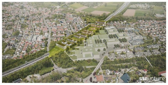 - Herrmann, M.; Arnold, M.; Fentzloff, A.; Otterbach, S.; Hawlik, J.; Kunz-Wedler, L. Abschlussbericht FREIRAUM für FREIBERG: Eine Landschaftsbrücke in hybrider Leichtbauweise mit Wohn- und Bürobebauung über die A81 für mehr Grün in Freibergs Mitte. 2020, 85. Available online: https://www.freiraumfreiberg.de/medien-raum-1/dokumente-1/ (accessed on 31 October 2022).