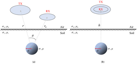 For a solid sphere, Grant and West gave an analytical expression of its electromagnetic response in a vertical magnetic dipole field [40]. The response model is shown in Figure 1a. and are the conductivity and permeability of the solid sphere, respectively, is the relative permeability, and a is the radius of the sphere. TX is the transmitting coil, is the transmitting angular frequency, and is the radial distance between TX and the conductor sphere. RX is the receiving coil, and r is the radial distance between TX and the conductor sphere. is the vector angle between r and . Therefore, the induced secondary magnetic field in the z-axis at the receiving coil can be written as: