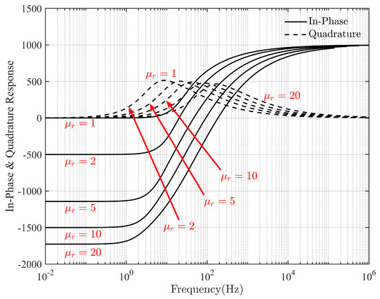 Then, the secondary field is normalized against the primary field and multiplied by , with part-per-million (ppm) as the unit. Figure 2 shows the frequency domain response of the sphere with different relative permeabilities.