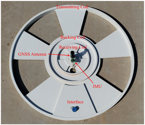 According to Formula (15), we designed a group of coils; the parameters are shown in Table 1. All three coils are hollow coils wound on the nylon skeleton with enamelled wires, and their resonant frequencies are far higher than the system bandwidth in order to avoid signal distortion caused by resonance. The nylon skeleton has the physical characteristics of a light weight, high dimensional stability, and difficult deformation. As a pod, it will not affect the balance of the UAV due to its weight, nor will it cause its internal shaking due to the movement of the UAV, so the overall sensor can maintain a good stability. In addition, GNSS and IMU modules were installed in the sensor center to measure the position and attitude of the sensor. The manufactured sensor is shown in Figure 6.