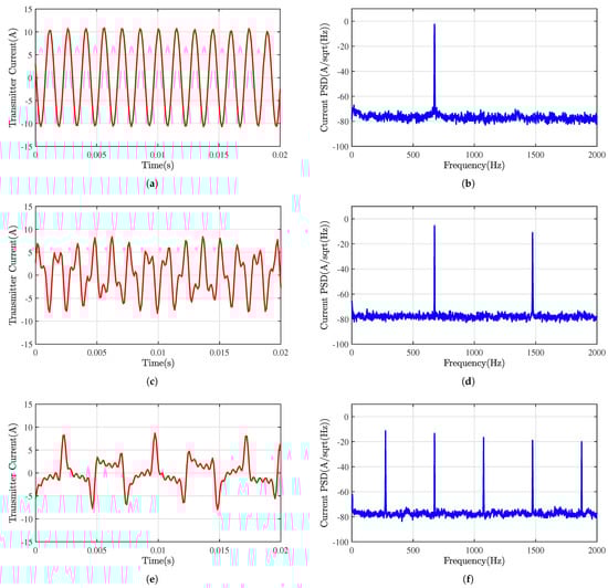 Figure 8 shows the waveform and power spectrum of transmitting a current of a single-frequency, dual-frequency, and five-frequency combination. It can be seen from the figure that, when transmitting a single frequency of 675 Hz, the peak current is approximately 10.6 A, and the signal-to-noise ratio is approximately 75 dB. The equivalent transmitting magnetic moment of the sensor designed in Section 3.1 is approximately 45.4 A. Affected by the coil inductive reactance, the higher the transmitting frequency, the smaller the amplitude of the transmitting current.