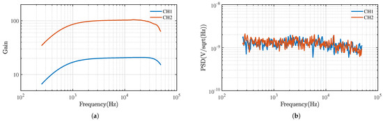 The receiving module is mainly composed of an analog signal processing part and an analog-to-digital conversion part. First, the original signal is amplified by the low-noise amplifier (LNA). Then, the clutter signal interference outside the available frequency band is filtered through an active band-pass filter based on Sallen–Key topology. Finally, the single-ended signal is converted into a differential signal. There are two receiving channels: one channel collects the transmitting current through the hall current sensor, and the other channel receives the induced voltage signal of the receiving coil. The performance of the analog signal conditioning module is shown in Figure 9. The two channels amplify the original signals by 20 times and 100 times, respectively, and the noise power density of the equivalent input is approximately 1.53 . Finally, the signal is digitized by a 24-bit Sigma-Delta ADC.