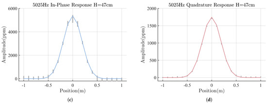 According to Formulas (10) and (11) in Section 2, the transmission frequency was set as 5025 Hz, and the height H was taken as 0.47 m and 0.76 m, respectively. The response value generated by the standard coil when the sensor moves in the range of −1 m∼1 m along the survey line was calculated, as shown by the curve lines in Figure 10. It can be seen from the figure that, since the sensor is of a concentric coil structure, there will be an obvious single-peak abnormal response when it moves right above the standard coil. The height H affects the response amplitude and the response change rate along the survey line. The higher the height, the smaller the response amplitude and the smaller the change rate.