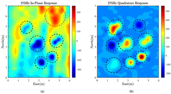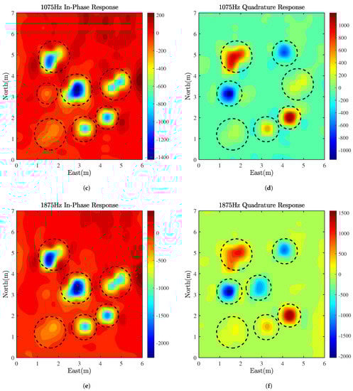 It is worth noting that, regarding the quadrature response at the frequency of 275 Hz, as shown in Figure 13b, target and target have unique negative responses that are different from other targets. According to the known target materials, it can be concluded that target and target are made of aluminum, and other targets are mostly made of ferromagnetic or steel. The relative permeability of aluminum is 1, and the in-phase response is mainly affected by the relative permeability, so it is difficult to have an obvious abnormal response in Figure 13a,c,e This feature can help us to distinguish the materials of the targets.