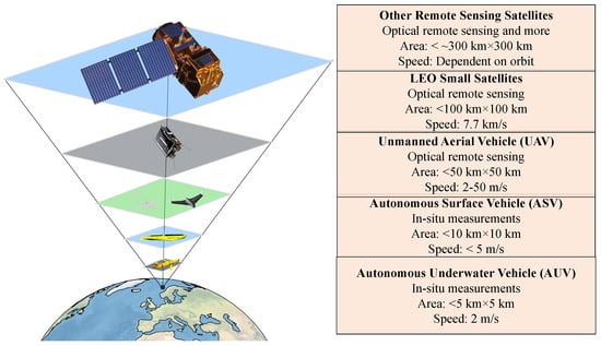 With these scientifically motivated requirements in mind, and the Goal of making oceanographic observations in support of marine research, the HYPerspectral Small satellite for ocean Observation (HYPSO) mission was developed at Norwegian University of Science and Technology (NTNU) [5]. The HYPSO mission will consist of several small satellites in sun-synchronous Low-Earth Orbit (LEO), starting with the first, the CubeSat HYPSO-1. This satellite program is part of a significant effort towards oceanographic data collection at NTNU Centre for Autonomous Marine Operations and Systems (AMOS), supporting autonomous agents such as Unmanned Aerial Vehicles (UAVs), Autonomous Surface Vehicles (ASVs), Autonomous Underwater Vehicles (AUVs) and buoys in their missions to collect data for ocean-related research. The observational pyramid, illustrated in Figure 1, consists of multiple platforms with different capabilities of spectral, temporal and spatial resolution measuring within the same region, as described in greater detail in [5,15]. In addition to the autonomous assets developed at NTNU AMOS, these campaign will also rely on the globally available satellite infrastructure intended to continuously cover the entire earth, e.g., the upcoming PACE mission.