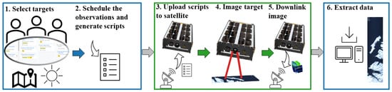 Overview of the imaging process. The planning parameters can be seen in Table 2. The blue boxes indicate human interactions. Currently, an automated pipeline is developed for data extraction. The green box indicates automated processes by the MCS and the satellite itself.