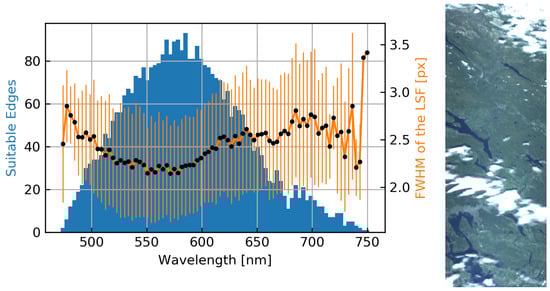 Multiple images of various scenes were analyzed, with similar results. Results from the particular image in Figure 6 are shown as most edges were found in this image which is an indication of confidence in the results. Figure 6 shows the results of the FWHM of the LSF estimation, with the image on which the assessment was performed to the right. The plot to the left in Figure 6 shows the mean of the estimated LSF FWHM for each band in a data cube, in addition to a histogram of the number of suitable edges used for the sharpness assessment for each band. Some bands at the extremities are removed as no suitable edges were found. The edges found by the sharpness assessment are almost exclusively in the across-track direction. Thus, this analysis characterizes only the across-track resolution. The mean LSF FWHM across all bands is 2.45 pixels. The best-performing bands have a LSF FWHM average below 2.4 pixels in the range 510 nm to 600 nm. The LSF FWHM for the sharpest band at 565 nm is 2.192 pixels. The standard deviations are higher than the 0.2–0.4 pixels typically found in satellite imagery. The resolution in worse-performing bands is beyond three pixels in terms of LSF FWHM.