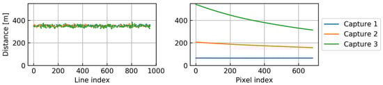 Ground sampling (“pixel-to-pixel”) distances of three captures with different off-nadir angles, determined using direct geo-referencing. No slewing maneuver was performed [5]. The left plot shows along track, and the right plot shows across track GSD. HYPSO-1 was holding a constant orientation during capture with respect to a reference frame co-moving with satellite and aligned with its orbital track. The y-axis range is equal for along- and across track for easier comparison between them.