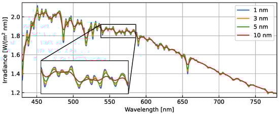Convolved reference irradiance. Solar irradiance spectrum at 1 nm resolution convolved with a set of instrument responses to obtain simulated solar irradiance spectrum at different spectral resolutions.