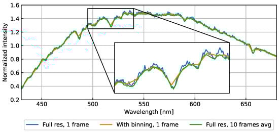 Raw spectrum of the Moon captured by HYPSO-1, with (orange) and without (blue) binning (spectrally binning nine pixels). Reducing noise by averaging 10 frames (without binning) is shown in green. Normalized intensity is recorded digital counts divided by the mean value in the spectrum.