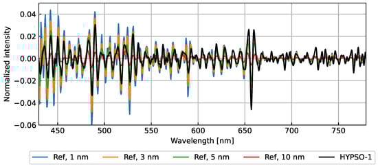 Comparison with reference spectra. HYPSO-1 data (black) and solar spectrum at different simulated spectral resolutions (shades of blue), after filtering and normalization.