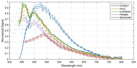 The shape of the curves in Figure 16 originates from the wavelength-dependence of water reflectance. Over water, the measured signals are mainly due to scattering in the atmosphere, and water is strongly absorbent in the longer wavelengths given in Figure 16. In addition, the variation in the shape of the curves between sensors originates from the wavelength-dependence of the quantum efficiency, i.e., the sensor’s sensitivity to different parts of the spectrum. The SNR estimate is expected to be higher in those parts of the spectrum with the highest signal. The comparison is complex because each sensor undergoes different types of pre-processing, in addition to the variance between scenes.
