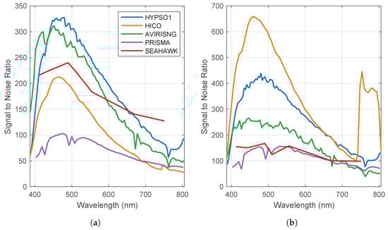 The PRISMA sensor has a higher spatial resolution than the other sensors listed here [17]. The increased spatial resolution comes at the cost of a reduced SNR for a given aperture [7]. If one were to bin the PRISMA scene to match the spatial resolution of HICO or HYPSO-1, the SNR of PRISMA is expected to increase by a factor of , where n is the number of bins [7,8,23]. For PRISMA, this would mean a doubling of the expected SNR. However, high spatial resolution can be necessary for some operational scenarios. Furthermore, the SNR reported here is of similar shape and magnitude as reported in a previous publication regarding PRISMA’s noise characteristics over water bodies [7]. Even though there is a difference between the two noise estimation models for the PRISMA data, both results are within the range previously reported. This result further validates the use of the noise models given here.
