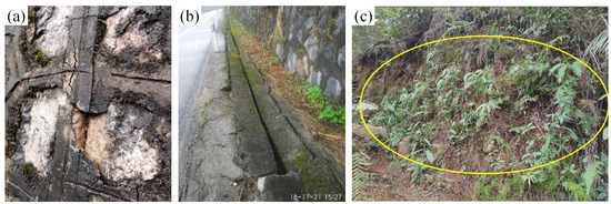 On-site findings in November 2018: (a) cracking of retaining wall, (b) guttering deformation, and (c) collapse.