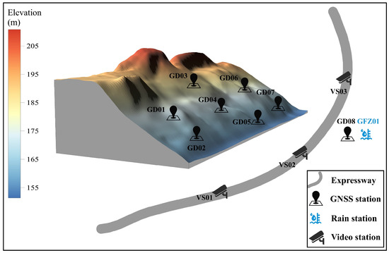 In November 2018, in the field investigation, prominent deformation characteristics were still found on this slope: wall cracking, gutter deformation, hill collapse, etc. (Figure 3). Considering the safety of the residents and the normal operation of the highway, a GNSS online monitoring system was constructed and started to operate in April 2019 [37]. The monitoring contents include the ground displacement, rainfall, and site environment, and the locations of the monitoring stations are shown in Figure 4. Stations GD01–GD07 are designed to monitor the ground displacement, and GD08 is located on the roof of the civil building opposite the slope as a relatively stable reference station. The GNSS results are obtained using relative static positioning with a 1 h solution strategy [38]. A GFZ-01 digital rain gauge is located at the same location as GD08. Three cameras are placed along the road to monitor the safety of the landslide and the road. The contents and methods of the monitoring system are described in Table 2.