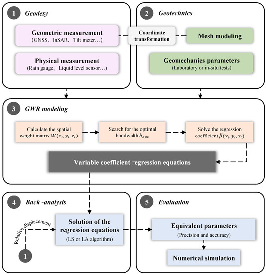 By using a multidisciplinary and combined approach, this study aimed to provide answers to the following questions: What else can we do after obtaining ground deformation data using GNSS, synthetic aperture radar interferometry (InSAR), and other techniques? Can the displacement back-analysis problem be expressed in terms of analytical functions? Are the equivalent parameters obtained by optimization back-analysis methods and DBA-ML methods reliable and stable? For this purpose, a spatial statistical method [34]—geographically weighted regression (GWR)—was employed to construct an analytical function model linking slope displacements and physicomechanical parameters. A novel back-analysis method is proposed where the multi-objective displacement back-analysis is represented as an analytical problem. The innovation lies in the establishment of the analytical function model for the displacement back-analysis problem, which aims to improve the interpretability of the back-analysis model. The validity of the proposed method was verified by taking a slope with a GNSS monitoring system constructed as an example.