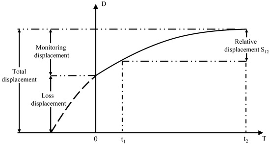 Generally, the displacements calculated with numerical simulation represent the deformation generated by the whole process. Partial displacement usually occurs before the monitoring stations are deployed, which is called loss displacement, as shown in Figure 6. If the monitoring displacement, which is lower than the actual value, is considered the actual total displacement and compared with the simulated displacement, there will be inevitable bias. Although several approaches for calculating the loss displacement have been reported in the literature [48,49], on the whole, the loss displacement has an uncertain and empirical nature compared to the directly obtained monitoring displacement. Here, a new strategy is proposed. The relative displacement obtained from monitoring is used to fit the simulation results from a certain deformation process. Taking slope excavation as an example, excavation starts from the moment , and the displacement tends to stabilize by after the end of the excavation. The relative displacement obtained at moment can be used to fit the simulated displacement, and the equivalent physicomechanical slope parameters are easily obtained using the back-analysis method. In this study, relative displacement was used for modelling and back-analysis.