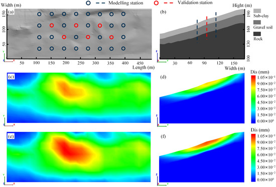 Thirty-two points were selected as ground displacement monitoring stations on the slope according to the principle of equal spacing: the data from 26 stations were used for GWR modelling and the remaining 6 stations were used for model validation (Figure 7a). Taking the mesh model at X = 254 m as a vertical section, three lines were selected as underground displacement monitoring stations, one of which was used for model validation (Figure 7b). By designing two scenarios (Table 3), two sets of slope displacement results, shown in Figure 7c–f, were obtained using simulation with FLAC3D software [57]. Finally, the data from the monitoring stations were exported to obtain a set of relative displacement data for GWR modelling and validation.