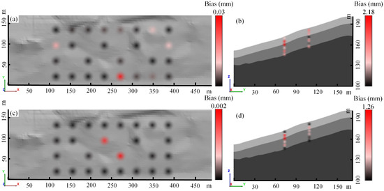 If the physical triggering factors of the slope deformation can be measured, constraints can also be attached to them, such as the change in groundwater level. When newly observed displacements are available, Equations (16) and (17) can be solved. Generally, . When and there is no conflict between the equations, the linear-algebra (LA) algorithm can be used to find the analytical solution to the equations. When , the least-squares (LS) algorithm can be used to find the optimal solution to the overdetermined system of equations with . Here, the solution will be optimally unbiased.