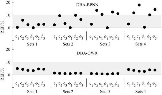 The accuracy of the inversion results for the four sets was counted with the REP, and an REP lower than 10% was used as the parameter tolerance interval for evaluation. As shown in Figure 9, the inversion results obtained with DBA-BPNN were correct for the data in sets 1 and 2. However, the data in sets 3 and 4 showed unsatisfactory performance, with some parameters located outside the interval. The accuracy rate of DBA-BPNN was only 75% (the accuracy rate was equal to the number of REPs lower than 10% divided by the number of equivalent parameters). Compared to the DBA-BPNN method, the DBA-GWR method achieved a higher accuracy rate of 100%, and the obtained parameters all lay within the interval. After that, the equivalent parameters determined with the DBA-GWR method were used in the forward calculation, and the simulated displacements for the validation stations were obtained. After statistical analysis, the precision with the first sets of data was lower than that with the other sets, but the RMSE and maximum bias were only 3.3 mm and 4.8 mm, respectively. This indicates that the proposed method could not only obtain more accurate equivalent parameters but also had good displacement precision.