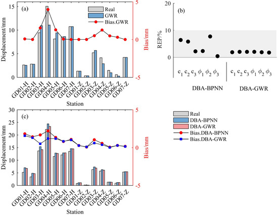 Both the DBA-BPNN and the proposed DBA-GWR methods were employed for the back-analysis. In the GWR model, in addition to the three combinations of shear strength parameters, the independent variables contained a constant and a value for the water-level change. Therefore, two constraints were added, as in Equation (17). Figure 11b shows the accuracy of the inversion results, and the REP was lower than 10%, the error tolerance interval for the parameters. Both methods determined the equivalent physicomechanical parameters with a perfect accuracy rate, but the proposed method had a lower error and higher stability than DBA-BPNN. Based on the equivalent parameters determined by the two methods, the horizontal and vertical displacements of the seven GNSS monitoring stations were obtained through simulation, as shown in Figure 11c. It can be seen that the displacements calculated by the DBA-GWR method deviated less from the measured displacement data. The quantitative results show that the RMSEs of the DBA-BPNN and DBA-GWR methods were 1.1 mm and 0.8 mm, respectively. The horizontal displacement of the GD04 monitoring station was the largest, and the bias of the DBA-GWR method was only 1.2 mm. The above results demonstrate the effectiveness of the proposed method.