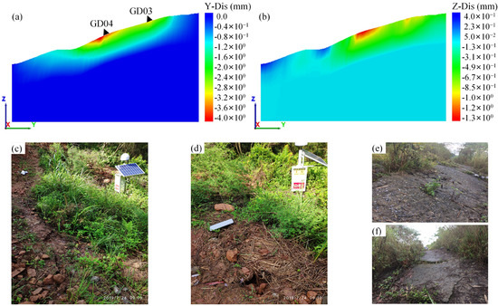 Numerical simulation techniques provide a powerful analytical means to gain insight into landslide damage mechanisms. This experiment combined the displacement back-analysis method, finite difference method, and strength reduction method to investigate the stability of the slope at the section where GD03 and GD04 are located. Since rainfall infiltration increases groundwater pressure, these increased pressures in turn induce slope movement. Therefore, the fluid–structure interaction model was used for the slope. The equivalent parameters obtained with the DBA-GWR method were used in the numerical model, and the safety factor of the slope was obtained using the tensile–shear strength reduction method (FOS = 1.84), which indicated that the slope was stable in late June. Figure 12a,b show the simulation results for the displacement in the critical state (FOS = 1). It can be seen that the slope deformation was larger in the horizontal direction, which is consistent with the GNSS monitoring results. Horizontally, GD03 and GD04 are located in the severely deformed area. On 24 July 2019, the field investigation results revealed significant cracks around station GD03, as shown in Figure 12c,d. Vertically, the displacement direction of the toe of the slope moved upwards through shear damage. This was consistent with the bulges found at the toe of the slope, as shown in Figure 12e,f, which were found on the lower slope. These results and phenomena confirm the accuracy of the numerical simulation and back-analysis results.