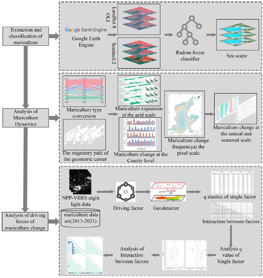 A flowchart of the methodology used in the present study is shown in Figure 2. The framework comprised the following components: (1) the extraction and classification of mariculture types, (2) an analysis of the expansion of mariculture, and (3) an analysis of forces controlling the mariculture dynamics.
