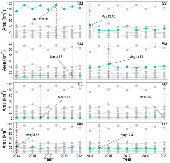 Plot showing inter-annual variations of aquaculture types in Zhao’an Bay from 2013 to 2021.
