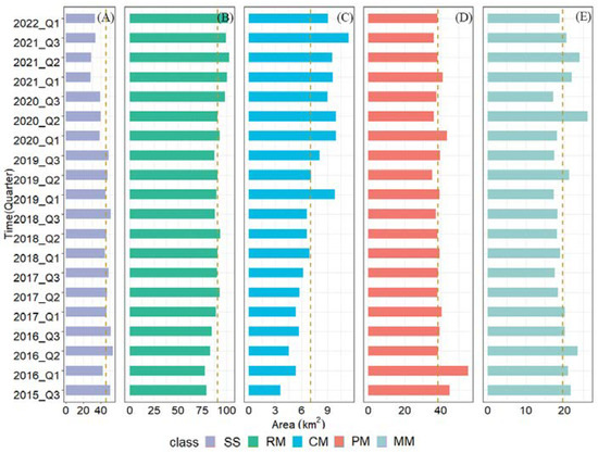 Seasonal variations in the dynamics of mariculture in Zhao’an Bay were also investigated, and the results are shown in Figure 8. Cage mariculture increased by 60.11% from the winter of 2015 to the spring of 2022, and the period between the winter of 2015 and the spring of 2019 was characterised by a rapid increase. Overall, mudflat mariculture was essentially unchanged, except for a notable increase of 30.5% from the spring to the autumn of 2020. Sea water is characterised by an overall decrease. Further, raft mariculture increased throughout the period studied, but the period from the spring of 2017 to the autumn of 2020 is characterised by minor changes followed by a significant increase in area. Changes in the ponds reached a maximum in the spring of 2016, and overall, they exhibited minimal variations.