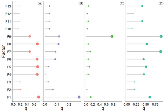 Drivers of changes in mariculture in Zhao’an Bay from 2013 to 2021 are displayed in Figure 9. Notably, grids with a small initial area (F1) exhibit the potential to expand for all types of mariculture, excluding the raft. Additionally, geographical factors (F4–F9) clearly impact all four types of mariculture. Even though all types of mariculture are also influenced by human factors (F10–F13), ponds display the highest impact. Human factors exert more influence on these changes as the variation in night-time lighting increases (F11, F13). Variables driving changes in various mariculture areas were estimated using GeoDetector, and these data are presented in Table A6 (see Table 1 for details on driving factors).