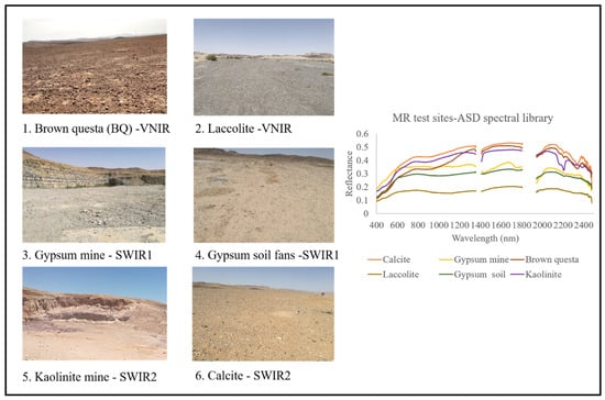 MR test sites. Different mineralogies and spectral signatures characterize the 6 test sites. Spectral signatures are from the spectral library acquired using an Analytical Spectral Devices (ASD) spectroradiometer.