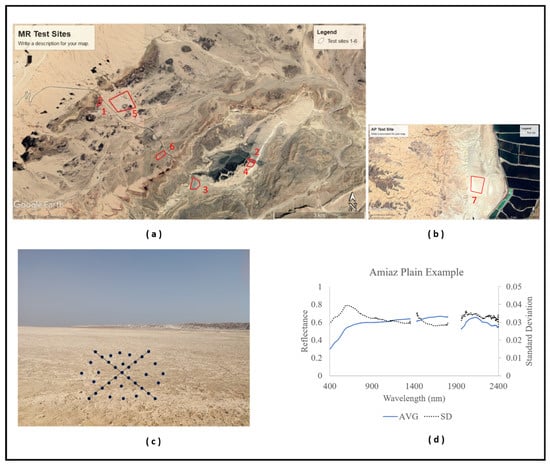 Location of test sites in (a) MR, and (b) AP. (c) Field spectral measurement protocol; example from the AP test site. (d) Average spectral signal (AVG, solid blue line) and standard deviation (SD, dashed black line) for AP 30 × 30 cube.