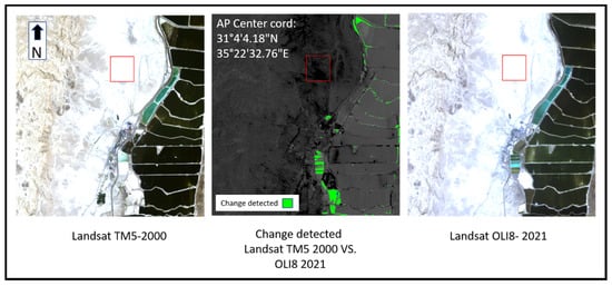 Figure 4 shows the spatial change detected from 2000 to 2021 (green pixels); the red box indicates the AP calibration test site area. The Dead Sea area had low anthropogenic activity and is situated in an extreme desert environment; the only significant changes detected were structural and in the water levels of the evaporated ponds of the Dead Sea salt factory. Most of the terrestrial area in general, and the AP area in particular, did not change, remaining stable over 21 years.