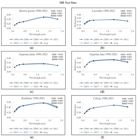 To examine possible changes in the spectral reflectance of the six test sites at MR, a comparison of the mean Landsat reflectance for the years 1996–2021 was conducted (Figure 7). The SAM, ASDS, and RMSE values were calculated against the year 1996 (t0) at each test site, and the results are shown in Figure 8.