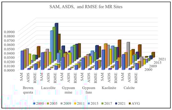 Figure 5a shows a comparison of the mean Landsat reflectance spectra for the years 2000–2021. An average of 200 pixels in each year were used for the comparison. The SAM, ASDS, and RMSE were calculated against the year 2000 (t0) to examine possible spectral reflectance changes. The results are summarized in Figure 5b. The average values of SAM, ASDS, and RMSE were very low (Figure 5a), and these low values were maintained across the years: SAM 0.01–0.04, ASDS 0.0004–0.005, and RMSE 0.008–0.04. Although the spectral resolution was relatively low (six bands), it could be concluded that the spectral reflectance across the 21 years was very stable.