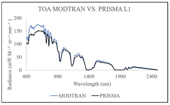 Radiance comparisons. TOA radiance from PRISMA L1 vs. MODTRAN simulation.