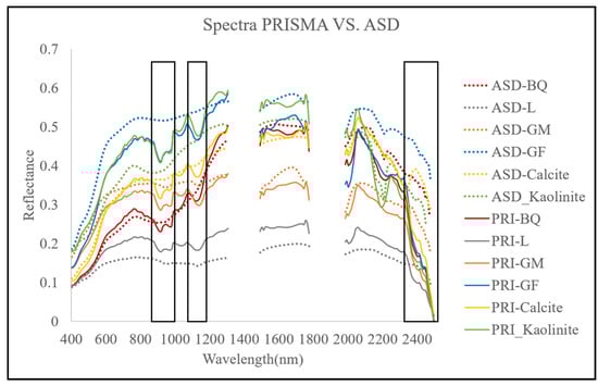 The flagged areas of concern (marked in black boxes, Figure 10) from the initial examination of PRISMA were in the VNIR range wavelengths, 920–970 nm, and 1100–1163 nm. This was probably caused by residual atmospheric absorbance (water vapor), which was not entirely removed in the atmospheric correction of the L2D product []. The exchange of PRISMA’s VNIR to SWIR sensor, which was in this range, may also have contributed. The SWIR2 range above 2320 nm showed a high deviation from the ASD signal; there was a sharp decrease in the spectra, and the calcite absorbance at 2340 nm shifted. This indicates that the performance of the atmospheric correction algorithm applied by the standard L2D processor for the SWIR2 bands is questionable.
