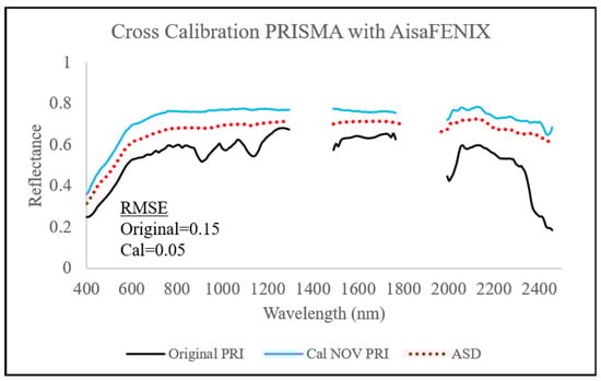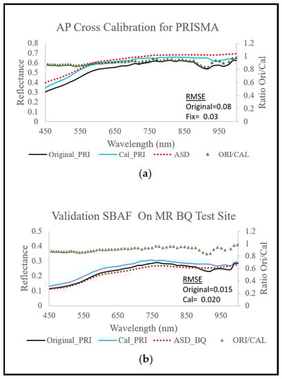We calculated the RMSE of PRISMA’s VNIR signal to validate our result. The RMSE decreased from 8% to 3% after the cross-calibration (Figure 11a), thereby improving the reflectance signal accuracy for PRISMA’s VNIR bands.