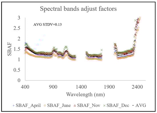 The spectral band adjustment factors (SBAFs) for PRISMA in different acquisition months (April—blue; June—orange; November—red; December—green; average SBAF—black).