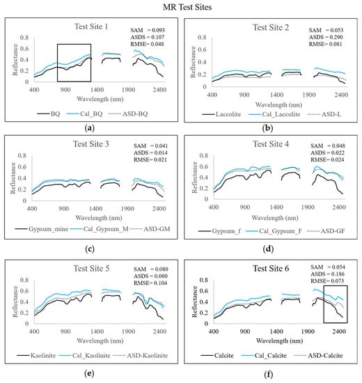 After applying the SBAF, the corrected reflectance well-matched the field ASD spectra in most test sites. The SAM results in all test sites had values <0.1 (the threshold for good spectral calibration). For the ASDS and RMSE, all test site results were below the threshold (ASDS < 0.1, RMSE < 0.05) except for Test Sites 2 (laccolite) and 6 (calcite) (Figure 14b,f), and the ASDS value for Test Site 1 (Figure 14a) was slightly higher from the thresholds (value of 0.107). This is because even though the signals for Test Sites 1, 2, and 6 were similar to the ASD, the RMSE and ASDS were more susceptible to albedo differences than the SAM.