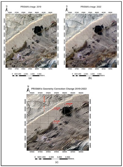 Comparison of PRISMA’s 2019 and 2022 geometric corrections: (a) 2019 MR image; (b) 2022 MR image; (c) 2022 image overlaid on 2019 image. Several drifts in the geolocation are marked with red arrows (2019—solid; 2022—dashed).
