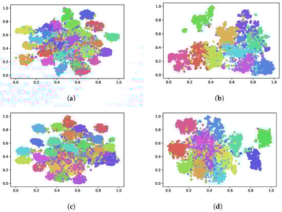 The t-distributed stochastic neighbor embedding (t-SNE) visualization; (a,b) indicate the training features and the test features of the NWPU-RESISC45 dataset, respectively; (c,d) represent the training features and test features of the RSD46-WHU dataset, respectively.