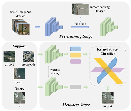 The framework of the proposed DL method consists of two stages: (1) the pre-training stage uses the tiered-ImageNet dataset to train a feature extractor, and then employs a remote sensing dataset to fine-tune the extractor. (2) The meta-test stage inputs the support set and the query set samples into the trained feature extractor to obtain the embedding features. We use the support features to train the kernel space classifier and predict the category of the query sample.